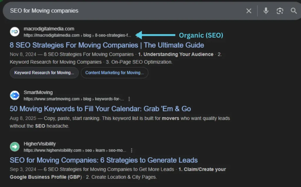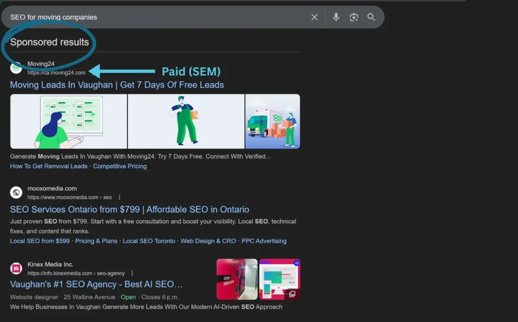 A moving company might run Google Ads for “last-minute movers Toronto” to instantly capture leads during peak season — something SEO alone might not deliver fast enough.